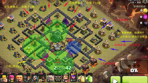 前戏太重要了,打之前要通过侦查把主攻方向的点防、x弩、迫击炮的射程、疑似电塔位置都看一遍,下石头后石头的目标和走向,都要了然于胸,丢炸弹人的时机,侧翼清边各2个法师怎么避免挨打?下双王的时机,防走偏,下弹跳的时机和位置,这些因素都要考虑好再打!