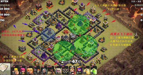 这里有个防双王跑偏的技巧:下石头后吸引射程内的火力,再下2个法师清两侧建筑(然后这2法师很可能被侧翼点防打掉),再下女王锁定中间的建筑!外侧清掉,男王跟进,这样外围连锁建筑被打断,双王就直奔中心而去!所以双王不要着急第一时间下,往往会被连锁的外围建筑吸引—跑偏清边去也~~