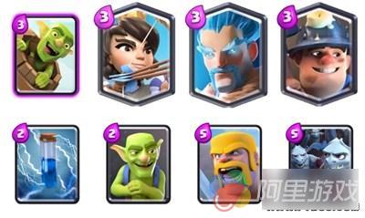 哥布林桶:偷塔专用卡牌,或者说是骗剑雨的卡,这张卡牌配合亡灵大军,能达到骗了一个剑雨,另外一个疯狂输出的状况。如果我们的哥布林桶被剑雨解了,那么矿工+亡灵大军的输出就很高。