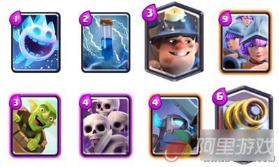 结合本套卡组,若你的起手是骷髅军团/小闪电/小皮卡/矿工这四张卡,那么请耐心等待对手先下,我们再兵来将挡水来土掩。
