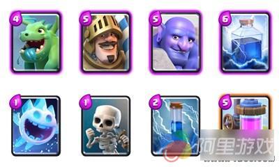 卡组弱势:王子和巨人分开容易被仇恨拉走,近不了塔。对空能力依然飞龙和冰雪精灵的作用,可能会相对不足,还需要小闪电的配合。4紫卡的收集难度不低,等级是这套卡组的硬伤。