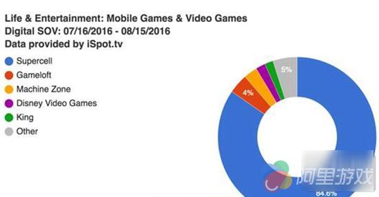 浏览次数紧随其后的分别是Gameloft、Machine Zone、迪士尼游戏和King,占比分别为4%、3%、2%和1.72%,加起来只有Supercell八分之一。