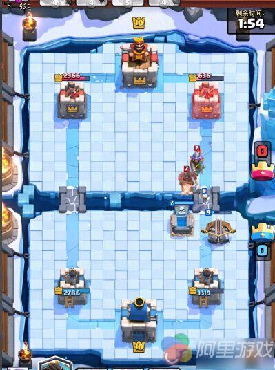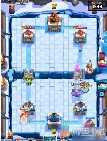 在对方进攻的时候,后置的蓝胖也走到了桥前的位置,那么连弩就可以摆出来了,而对方看到连弩的第一反应放出了冰法,图中也能看出,这里蓝胖刚搞♂死了一个单位。我只要在中间摆放一个墓碑,那么这矿工配合哥布林的进攻也就被我化解一半了。这里如果对方再下亡灵大军来防守的话,可以靠蓝胖承受伤害,同时对方要吃我的万箭齐发了。