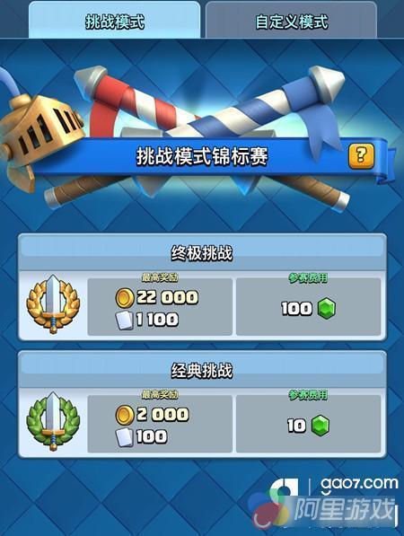 在《皇室战争》里,现在的锦标赛被区分为挑战模式和自定义模式。在挑战模式中,玩家可支付10宝石或者100宝石开启挑战,门票费用决定了对应胜场的奖励额度,并不影响实际的挑战难度。同在挑战池中的玩家会根据实力进行匹配,玩家胜场越多,奖励越高,12胜封顶,战败3场比赛结束。说白了,这个挑战模式规则与《炉石传说》的竞技场如出一辙。