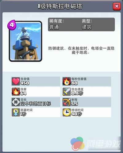 电磁塔的费用消耗为4圣水,攻速和射程两项数据与加农炮保持一致,但是持续时间和生命值都要比加农炮更有优势,而且可以陆空兼顾,面对气球兵、飞龙这些空中兵种,不仅仅能起到拉仇恨的作用,还可以发起进攻。