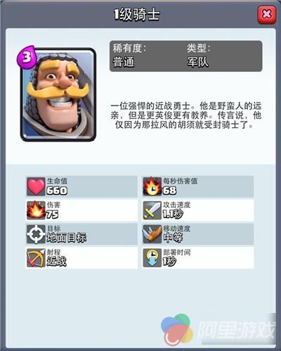 骑士这张牌是游戏中最平衡的存在,可观的血量、不错的攻速还有中规中矩的伤害,这些优点加起来只需要消耗3点圣水,性价比还是非常高的。低阶环境中骑士的出场率一般,因为低等级骑士的威胁并不大,但是在高阶环境中骑士的出场率还是非常不错的,满级骑士拥有2000+的血量,伤害值也达到了231,不论攻守,骑士都可以起到吸收伤害兵打出一定伤害输出的作用。