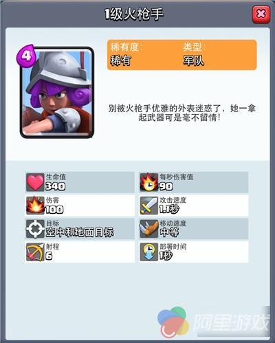 新手前期获得的对空单位不多,火枪手算是其中最为优秀的了,4费就拥有不错的血量和超高的伤害,射程6意味着绝大多数单位都还没有正式发起进攻,就已经走入火枪手的攻击范围。火枪手是前期克制飞龙宝宝和气球兵等空中单位的主力,对巨人等肉盾也可以起到不断削弱血量的作用,到了后期也可以用来解熔岩猎犬,实用性还是非常高的。