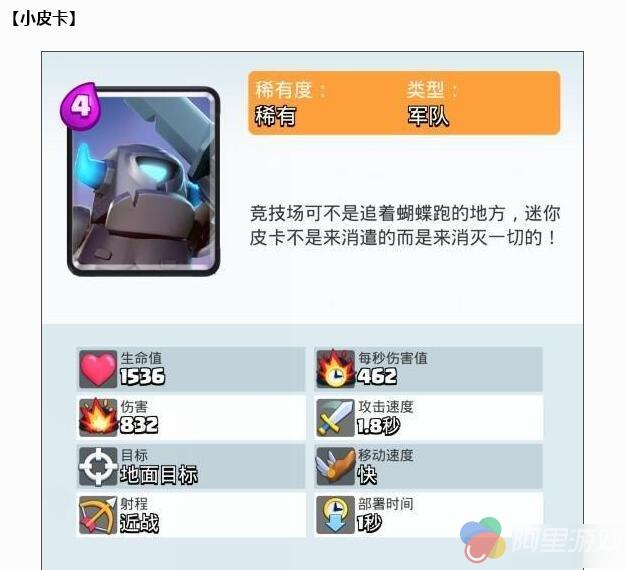 小皮卡主要用于防守时克制对手的肉盾,例如新手都有的巨人、中阶遍地跑的野猪以及高阶的皇家巨人,用于切后排基本也是一刀带走一个,毕竟满级小皮卡每砍出一刀的伤害值就达到了832,高血量肉盾都扛不住几下,更别说是血薄的后排兵种了,想想都觉得很痛!