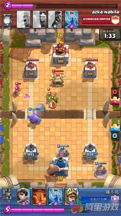 遇到气球流进攻时,我们这套卡组的防守就会有一些吃力。所以我们要做好进行反攻的准备。先下出公主消耗敌人的气球兵,并用王子消灭敌人的巨人。然后迅速下出前置巨人,进行反攻。