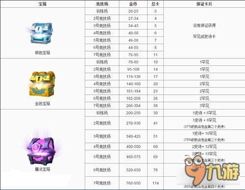 目前皇室战争中游戏可获得的宝箱有三种,分别是:银色宝箱、金色宝箱、紫色宝箱。另外还有根据时间获得的免费宝箱。那么这些宝箱都能开出什么卡牌呢?下面九游小编特地为大家整理了一下宝箱的相关数据,让我们一起来看看吧。