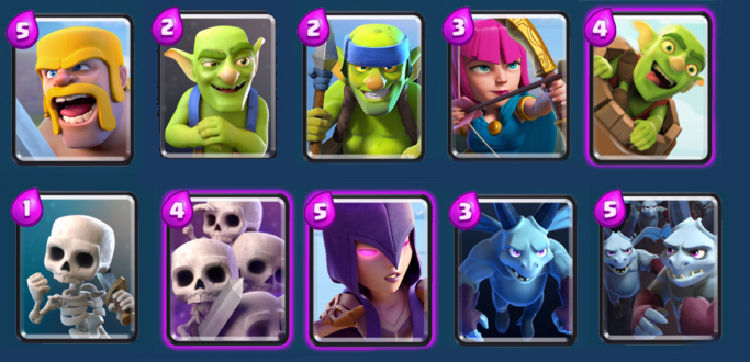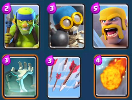 这6张史诗卡牌中,一般都会有2种以上,配合之前推荐的6张卡牌,可以组成一套不错的上分卡组。如果拥有X连弩,可以考虑选择这张做为固定的核心卡牌,因为X连弩往往能在消耗战中找到机会"偷掉"对方的护卫塔。最后一张的话,比较推荐用空中爆发的气球兵,因为气球兵相比于王子的突进,不会受到骷髅兵或者野蛮人的干扰,且爆发输出高。所以,在这个阶段,我们可以总结出一套容易组成的的兼顾防守与输出的上分卡组。