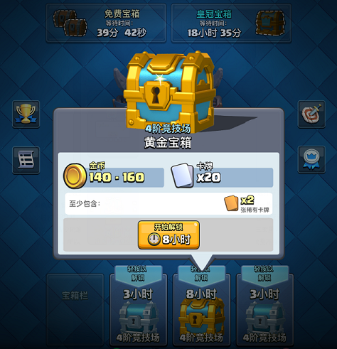众所周知,《皇室战争》中的箱子最多只能积累四个,当玩家拥有四个箱子后再进行比赛是不会获得新箱子的,这确实会给玩家一种错觉——我每天能拿的箱子很少,其实不然,按玩家每天能够刷出一个黄金箱子其余皆为银箱子来计算,玩家们一天可以开24小时=(3小时银箱子)x5+(8小时金箱子)x1+3小时损耗。当然了,睡眠时间来开橙箱子是基本常识,再加上左上角平均一天五个(四小时一个最多可叠加两个)的免费宝箱和每天一个的皇冠宝箱,我们一天至少可以开启10个种类不同的宝箱,这比炉石每天一个任务可要多不少了!