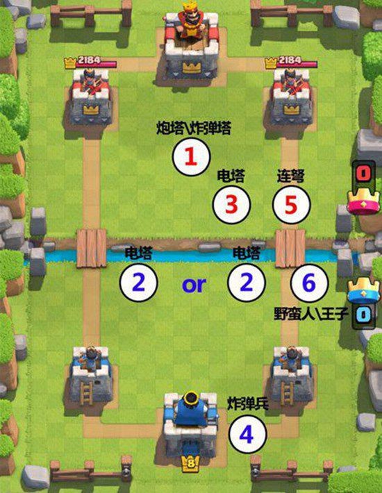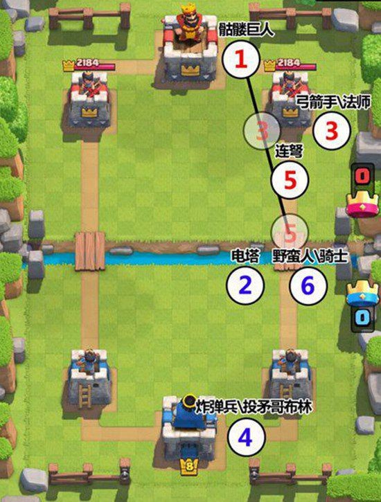 A.底线放骷髅巨人(这时候就已经要警惕了,手上没火箭没肉随从的,赶紧过牌),当骷髅走近河道时,他们就会在后面放连弩外带其它小兵,你这时候放的兵大部分都会被骷髅巨人留下的炸弹炸死。怎么办?在对手下骷髅巨人后迅速部署防御设施,防止对手在连弩附近架设其它建筑,就算最后对手不下连弩,这个防御设施也可以起到防御骷髅巨人的作用,具体步骤看下图。