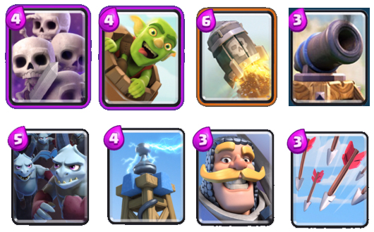 最关键的这是一套贱贱哒的卡组,有把对手打到心理崩坏的潜质,整套卡组的核心由骷髅大军,亡灵军团以及哥布林全家桶构成。3张核心卡牌全都需要使用万箭齐发或火球等法术牌来解。