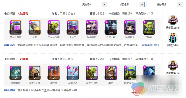 玩家卡组页面新增显示所到杯段、平均耗水、竞技场解锁等级、每个卡牌等级等信息,并添加竞技场等级筛选功能,你可以根据自己所在的等级查看别的玩家给你推荐的卡组。点赞数最多的卡组也会优先显示在前面。让你在查看别的玩家卡组的时候,可以更好地找到自己想要的卡组。