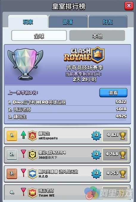 自打皇室战争游戏上线测试开始,全球玩家榜前几名就被一个ID叫做“钟培生”的大神、他的小号和他所创立的HKeSports部落成员把持, “钟培生”即是这家香港电竞俱乐部的老板。他亲自实践出多样打法,可以说是《皇室战争》开荒一代。然而随着赛季更新,高手频现,如今他一度跌到40开外,花了近一周的时间才重新回到第一,可见战局紧张。