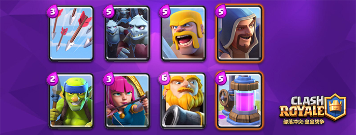 皇家巨人、男法、箭雨、弓箭手、亡灵、圣水收集器、哥布林投矛手、野蛮人。