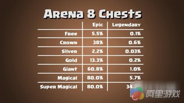 因为更高级的竞技场包含更多的卡,所以你获得传奇卡的概率会随着你提升竞技场等级而提高。按照计算,如果你在 A7 ,并且每一日都开完全部宝箱,你获得 1 张传奇卡大概需要 54 天,如果你在 A8 ,则大概需要 42 天。