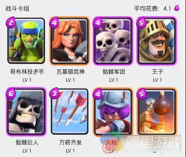 卡组要点:平均耗水4.1算中等偏高,但是这套牌最明显的就是解卡多,打的就是防守反击,乘对手没水的时候做到一波带塔的效果!比较适合A4-A6,王子是卡组的关键套牌,对面巨人+后排兵推过来的时候可以放王子切后排,然后打反击,当对面没有低费防王子时,让王子冲到塔前就是直接爆炸,那个伤害非常的恐怖。王子尽量别开局就下,要不然很容易被对手直接溜起来,然后只能任人宰割了。大骷髅防守能力就不用说了,但是如果让他死在塔前,那造成的伤害非常的可怕,但缺点跟王子一样非常容易被溜,如果碰到小黄人切后,那就会被无伤防住,所以我一般把大骷髅和女武神放在一起进攻这会让对方非常的难受!