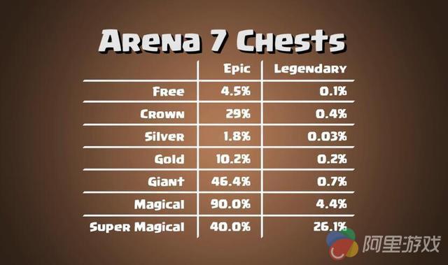 第一列数据是紫卡的掉率数据,第二列是传奇卡的掉率,从上往下分别是免费箱子、皇冠箱子、白银宝箱、黄金宝箱、巨型宝箱、神奇箱子、超神箱子。有一些玩家在普通箱子也能开到传奇卡,这概率,仅仅只是0.1%,但超神箱子还是有26%的概率, 会开到传奇卡,概率还是很高的