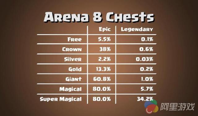 再来看看8级竞技场的数据,超神箱子开到传奇卡的概率增长到34%,普通玩家大概花42天左右,就可以获得一张传奇卡牌