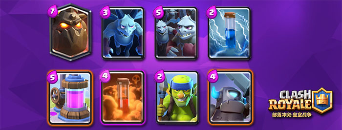 毒狗流是由原毒石流作更改。先前版本我曾以0368强度的毒石流稳定A8(石、毒、哥布林小屋、水罐、加农、矛哥、大小苍蝇),上个版本里的主流野猪、迫击炮,正好能被我这套毒石所压制。而经历上次更新,虽然卡牌等级提升上去,分数却直直落下,一度从3400来到2500。究其原因,不外乎是天梯环境变化。