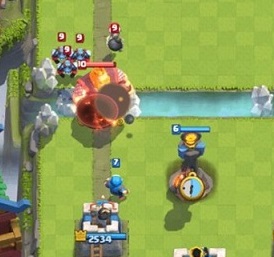 巨型骷髅除了肉盾效果,后续爆炸伤害也非常可怕,法师跟进帮助清理杂兵,是一波很凶的攻势,同时之后的气球兵也直奔公主塔。我方采取了法师过河瞬间用野蛮人截杀的打法,虽然最好的方式是围杀法师减少野蛮人损伤,但是巨型骷髅已经接近公主塔必须把它拉回去,之后地狱塔中场河边拉走气球,或者法师+哥布林投矛手清理气球,都可以轻松防守。