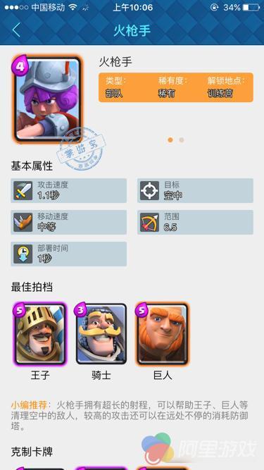 好的,我们现在开始考虑防空,箭雨这样一个从A1到A8都被青睐的法术当然实用价值不差,有了法术之后,我们还需要加入一张克制空军类卡牌的远程兵种,火枪手,这个从训练营解锁的超长射程兵种,可以配合公主塔有效防守大型空军单位(如龙宝宝,气球等),加入这张卡以后能有效的组织一波防守进攻。