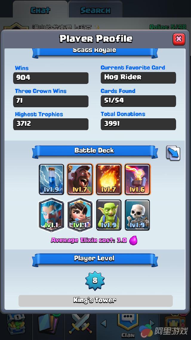 皇室战争看到最牛逼的8级玩家,这套卡组的强度是 1079,拥有2个1级的传奇卡 寒冰法师跟公主,7级的野猪跟火球,6级的炼狱之塔,9级的小闪电、哥布林及骷髅。平均圣水花费3.0,虽然有 2个传奇卡,但最高杯数达到3712,应该是很牛逼的存在了。