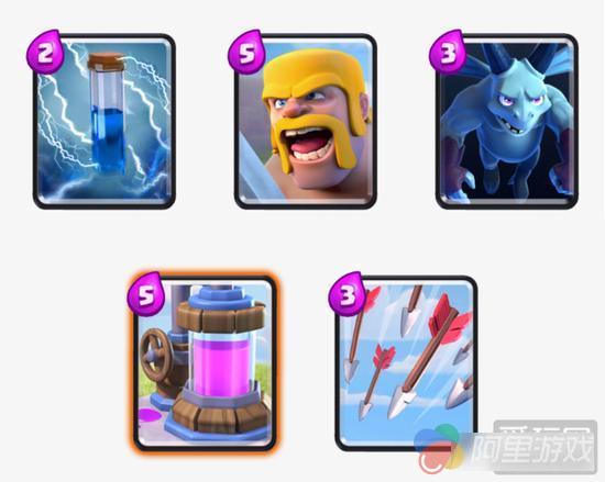 万箭齐发:万箭齐发和火球,基本是必带的法术之一,用途很广,不需要多说了,主要是清理对面的低费人海,或者公主这样干扰性很强的卡。同时也可以作为最后关头的补刀卡,使用率很高。