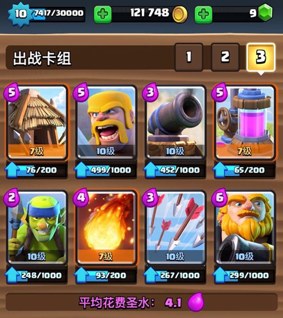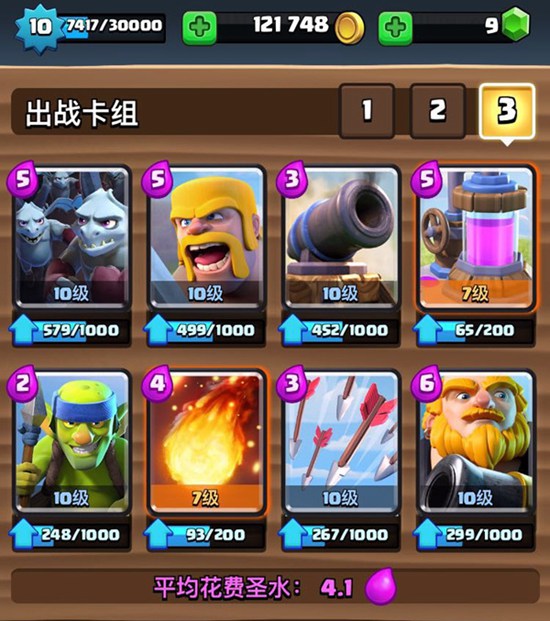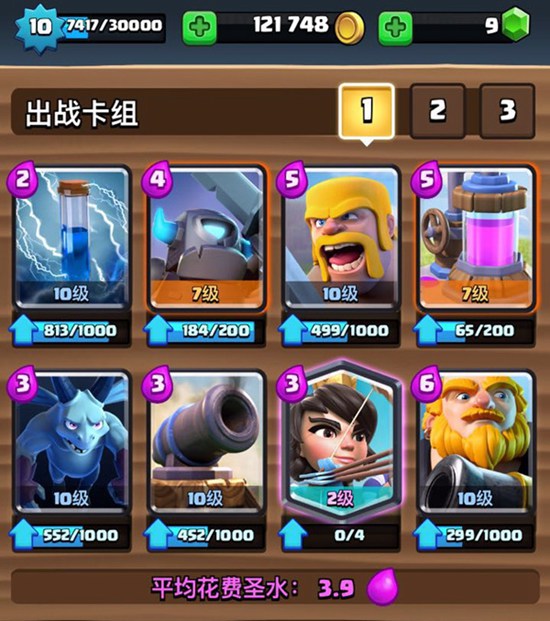 这是我现在用的卡组,记得当时天梯前十有三位大神都是这套,一模一样的八张,于是怒截图,这周终于买到了冰法,终于组了起来。不得不说,公主和冰法真的OP,防守端实在是太强了,走得慢适合过牌,打起来也怪强,讲道理应该削弱。我直到参加CI的线下赛之前都没有用过公主和冰法,比赛中用过之后就觉得没有传奇卡不会玩了。。。无论是冰法还是公主配合小闪电都可以瞬秒苍蝇群,这就是我觉得现版本起码A8苍蝇群不强的原因,商店能买传奇之后几乎人手双传奇,苍蝇群贼难生存。另外一点是这套没有带加农炮,我觉得非常有道理,不仅仅是新版本加农炮再次削弱的原因,更是加农炮与赚费反打的思路不符。野猪和皇家巨人在什么情况下才能凭一己之力打掉你的费用?只有你拍加农炮的时候。如果是用黄毛解,你是一点费都不会亏的,解完直接拍皇家巨人反打,这才是符合我的思路。不带加农炮的确会掉更多血,但是反打的力度更强,我觉得是值得的,毕竟如之前所说,皇家巨人在打成1:1后很强,互换一塔是我可以接受的。我是这周开出的冰法,还没认真冲分,每天打打宝箱胜率很高,现在3400+,等我赛季末再来更新感受。
