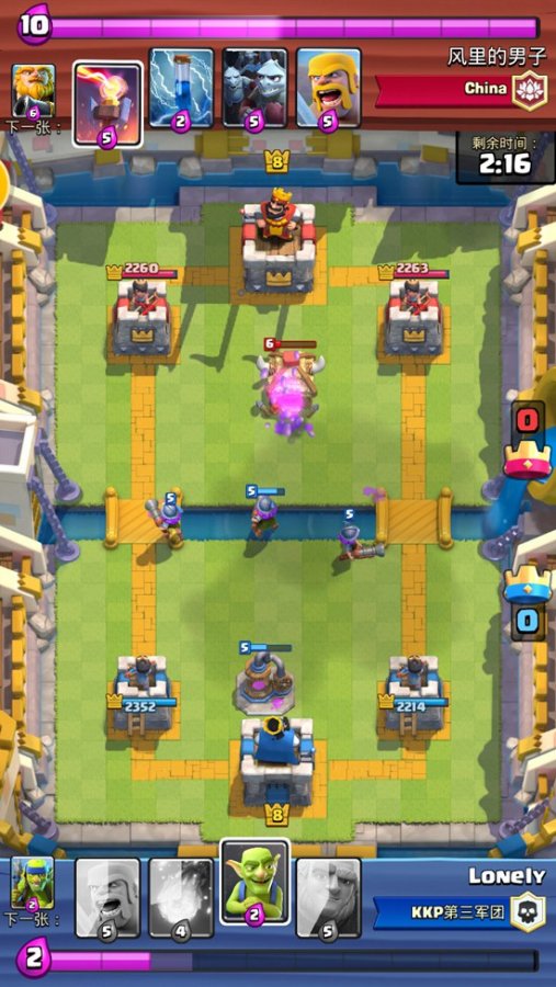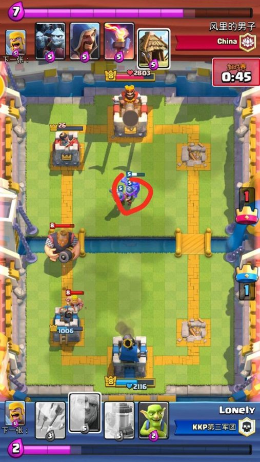 第三,三枪在加时赛换血的时候,你可以下在允许范围的最里面在那个点你可以秒打公主塔,伤害爆炸,就算别人防了你也可以打到几枪,伤害差不多可以试试,不过还是建议三枪先在己方中路守一波 清完对面的单位,等三枪过河 巨人下在那个位置把两个塔的伤害都拉到 然后哥布林直接去戳主塔 对面难受的要死。本来对面才进攻完一波 水量就差一截 等火枪过去了 对面一定会全力守 哥布林都无暇顾及 这时候你在对面中路在下一个冰法投矛 3点之间互相打掩护 对面怎么防都会被旁边的点到。 看图: