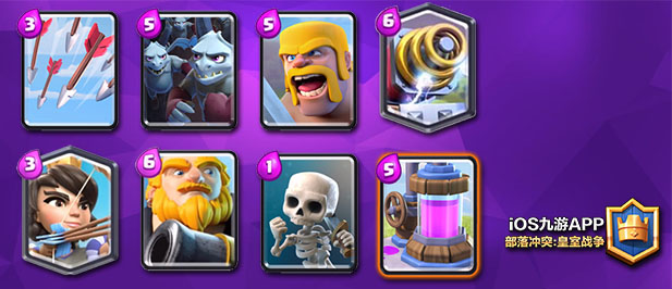 然后是皇家巨人,这张牌的作用就是主攻手。所以我们的卡组是以皇家巨人为核心的,电磁炮作为一个比火法只高1费的单位,在双倍时间配合皇家巨人可以让对方手忙脚乱。