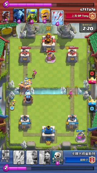 对方皇家巨人/胖子/大皮卡沉底,或者黄毛过河,我直接电磁炮,桥头下黄毛/骷髅/苍蝇海,等于对方亏6费被我开一波车,这波即使对方有解牌费用也很难解完直接崩。