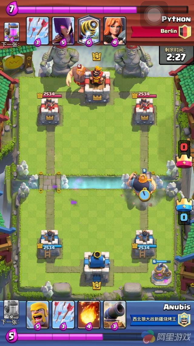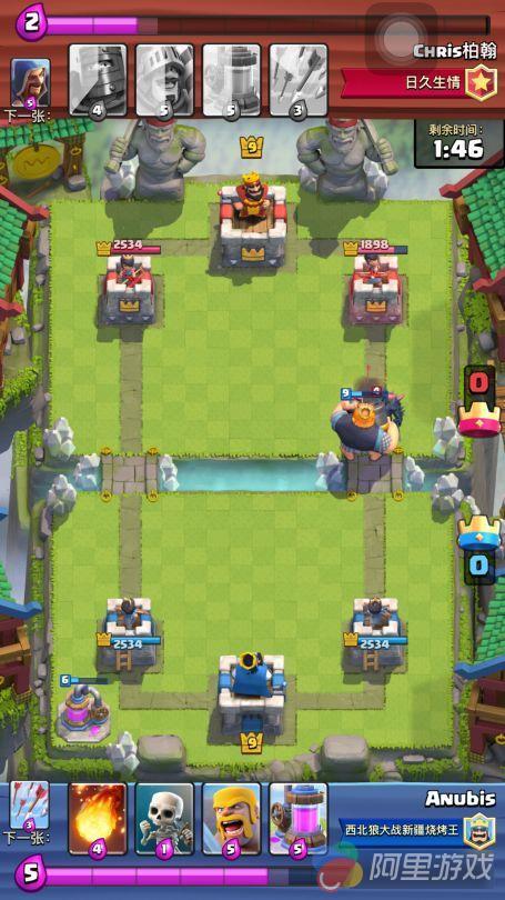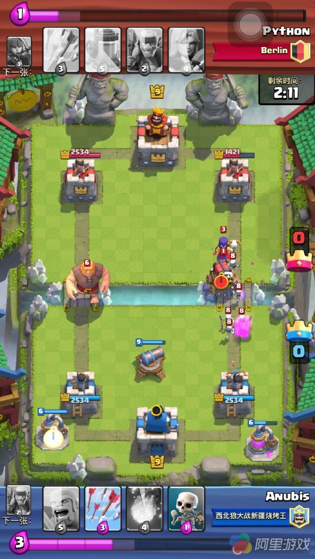 之后,迫使将这个组合分开了,分成了2路,在没有胖子在前面开路的情况下,光有电磁炮和女巫还是很容易处理的!只需要简单的用低费骗去电磁炮的一炮,然后趁着充能的时候围殴他们就行了!