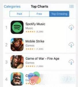 4月26日,音乐流服务应用Spotify登顶美国iOS畅销榜,Supercell的两款游戏分别排在第4和第5名,落后于MZ旗下的两款游戏。