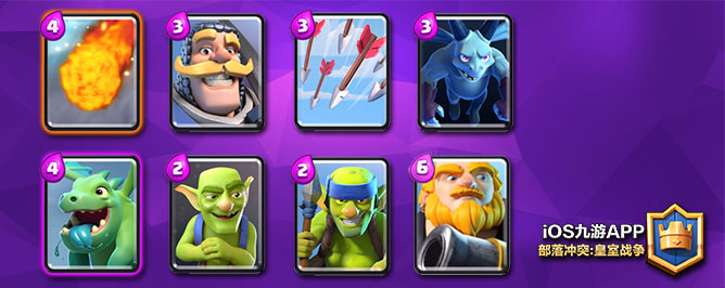 皇家巨人的卡组讲究的就是一个进攻的组合搭配,前期我们可以先用骑士、哥布林或哥布林投矛手去刷齐手牌,一波标准的进攻我们务必准备好皇家巨人、飞龙宝宝和火球,这三张卡缺一不可所以前期要找好机会去刷牌。