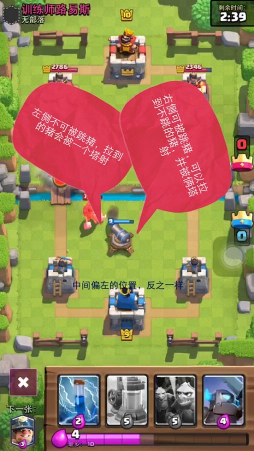 (b)单猪的话一个土炮就解了,但是我更喜欢用皮卡,猪敲我一到两下,我赚四费,直接一套反打推过去,直接进入你的节奏了,而土炮是死的不能参与进攻。(当然你塔血本来就不健康的前提下就不要这么玩了)单猪出现往往是开始第一次试探的
