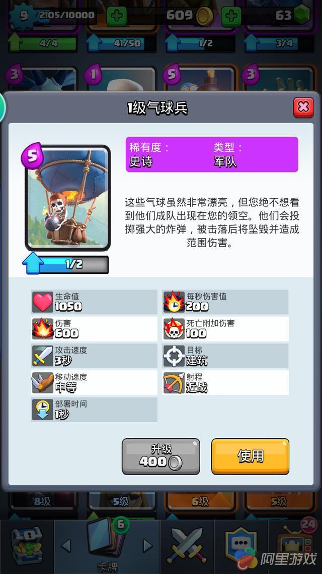 气球是低阶紫卡,空中单位,可以给建筑物造成毁灭的伤害,如果让它给你的公主塔来三下,你的塔不破也是岌岌可危了!不过本事血量不高,容易被引走!