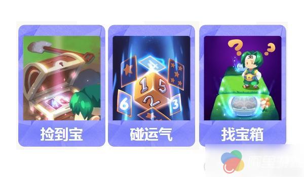 “找宝箱”五回合内买地升级都有几率获得5~6级卡片或者初始资金30%,配合乌龟卡等步数类卡片可获得更大收益。