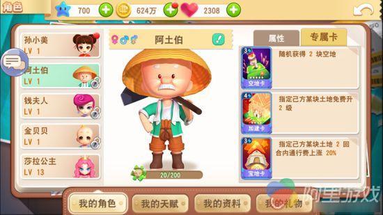《大富翁9》中每个角色都拥有自己的独特属性,例如阿土伯就是强力的占地类角色,其专属卡均和土地相关: