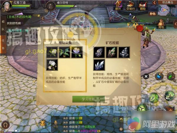 玩家在达到13级时可以学习生活技能,目前开放的生活技能有两种,一是植物采集、二是矿石挖掘。附带衍生技能是铁匠和纺织。