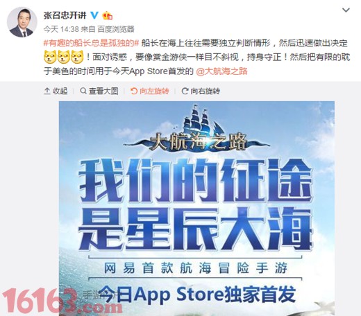 9月8日,网易首款航海冒险手游 《大航海之路》正式App Store 独家首发。游戏中基于游戏真实世界观的贸易玩法、真实热血的海战玩法,以及新增“自由探险”模式的主题探险玩法,引发了众多航海迷下载体验,“局座”张召忠更是第一时间专程发布微博,与航海迷亲密互动,祝贺游戏开测火爆。