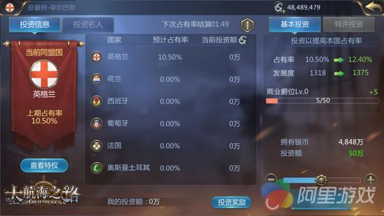 玩家不仅可以投资本国首都和领地,还可代表本国对同盟港口进行投资,投资越多即可获得更多的占有率,当港口成为本国的同盟港口时,本国玩家即可在该港口享受免税待遇;同时,通过港口投资,玩家还可获得商业声望,并提升爵位,每个港口的投资第一名,可获得总督顾问的称号,在该港口享有固定的特有停船位;随着玩家商业声望的累计,玩家有可能成为本国首席大臣(由本国公民投票选出),享有特殊称谓和全球免税的特权。
