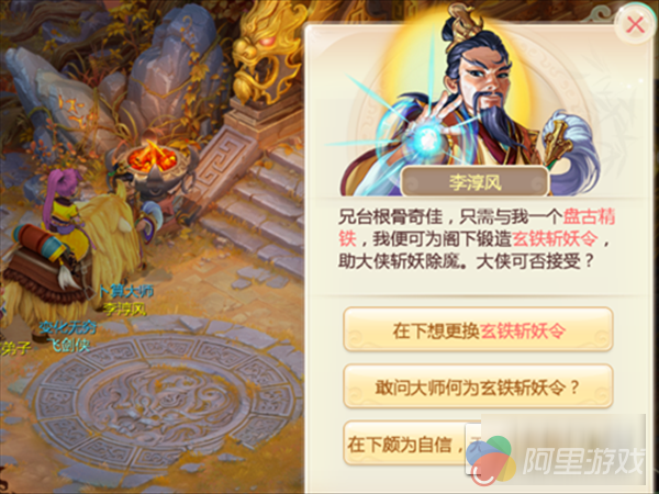 在野外山洞场景当中,玩家将与兜率宫首席弟子和卜算大师李淳风两大NPC相遇。与是兜率宫首席弟子对话,即可按照已完成进度选择希望进入的魔王窟副本关卡。与此同时,选择与卜算大师李淳风对话,玩家(队伍)还将获得挑战魔窟的强力增益道具——玄铁斩妖令(有效周期一周)!