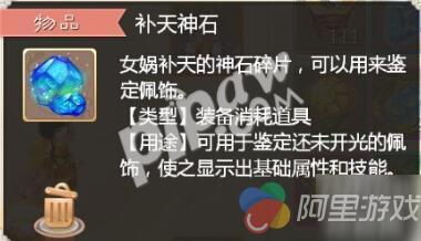 玩家通关魔王窟副本以后,会得到还没有开光的佩饰【“待鉴定”的挂件】,这些佩饰的属性、技能都需要鉴定才可以查看,否则无法使用,而补天神石就是鉴定佩饰需要的其中一个道具,鉴定佩饰需要盘古精铁、玉符和补天神石。