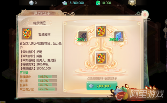 佩饰到一定等级后,玩家还可以通过消耗盘古精铁、佩饰残片及银两,开启佩饰继承功能。将佩饰的基础属性按百分比转移到另一件同等部位的佩饰上,继承的佩饰获得原佩饰的基础属性类别和百分比,同时原佩饰不会消失。通过佩饰继承的功能,玩家也将拥有不同属性类别、属性数值更加强力的佩饰!