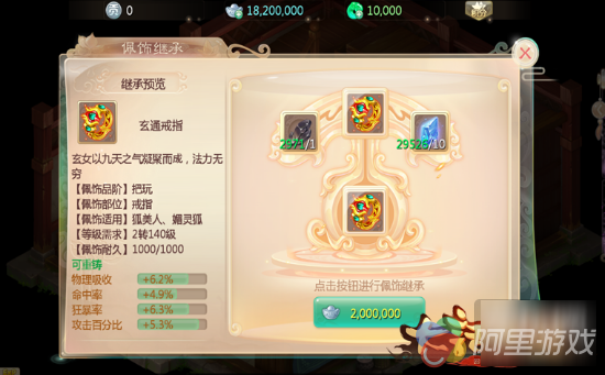 佩饰到一定等级后,玩家还可以通过消耗盘古精铁、佩饰残片及银两,开启佩饰继承功能。将佩饰的基础属性按百分比转移到另一件同等部位的佩饰上,继承的佩饰获得原佩饰的基础属性类别和百分比,同时原佩饰不会消失。通过佩饰继承的功能,玩家也将拥有不同属性类别、属性数值更加强力的佩饰!