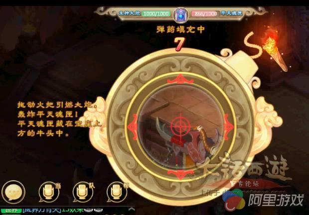 2、开炮队员,画面右下角有一个火把,有10秒倒数,其提示是:弹药填充中,倒数完10秒,可使用右下角火把,移动上炮头的点燃药引,点燃开炮,对准平天魂匣开炮,直到打碎为止。