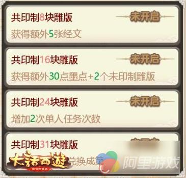 完成“开启雕版”任务,即可开始体验“雕版印刷术”当中最为独特的上墨环节。玩家可以使用“开启雕版”任务中累积获得的墨点奖励,对雕版上刻下的经文进行上墨。上墨方式将分为普通墨点上墨和九宫格拼手气上墨,玩家可根据自己的喜好选择相应的方式对经文进行上墨制版。